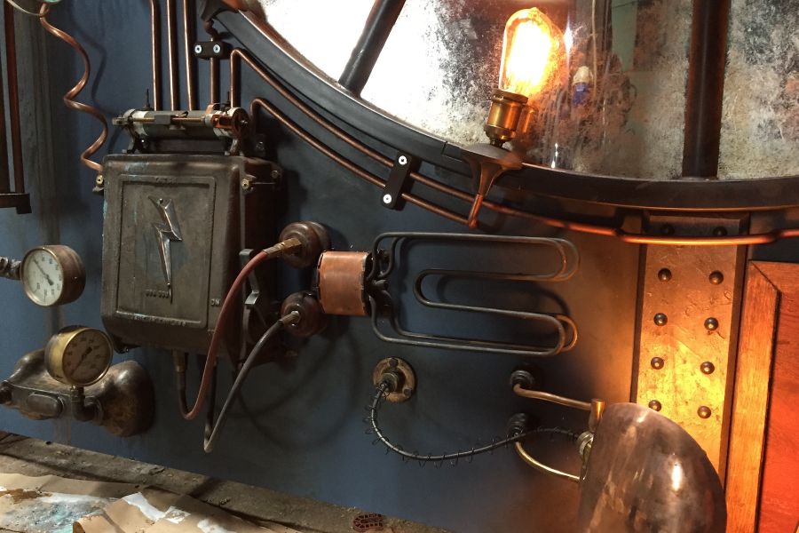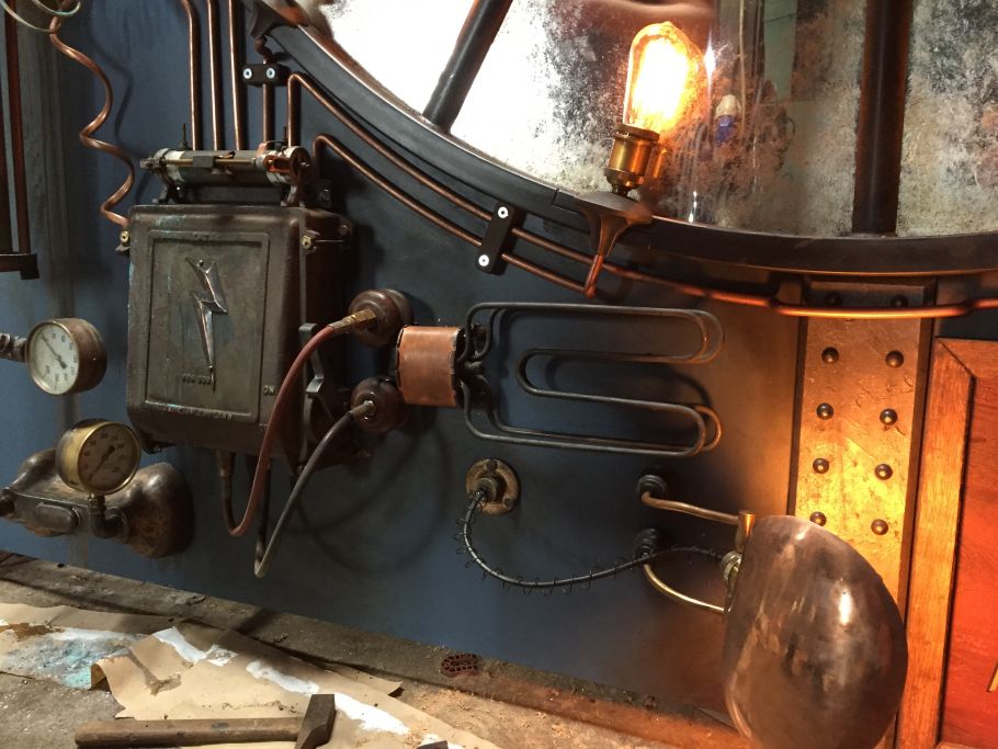 The finished piece was a stunning showcase of artistic engineering, featuring motorised chain-driven planetary gears, moving pistons and flywheels, Eddison bulbs, mirrored glass and steam diffusers. We got creative, applying faux finishes and aging the new components with oil, dirt, grease, wax and a plethora of paint finishes that would make any props master proud, bringing the whole thing together into the piece you see here.