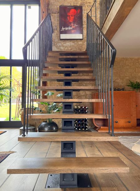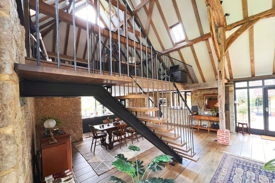 The brief was to build a staircase to reach a mezzanine floor that would be practical and elegant, letting in lots of natural light but without taking up too much of the open space in the barn. It had to be utilitarian without being harsh and cold. The palate of materials for the renovation was to focus on exposed stone, original oak beams, and muted colours.